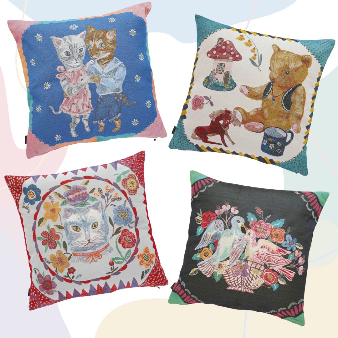 ナタリーレテさんの描く世界観をゴブラン織りのクッションカバーに落とし込みました。動物や草花など、どこか懐かしくてユーモラスなモチーフがデザインされています。