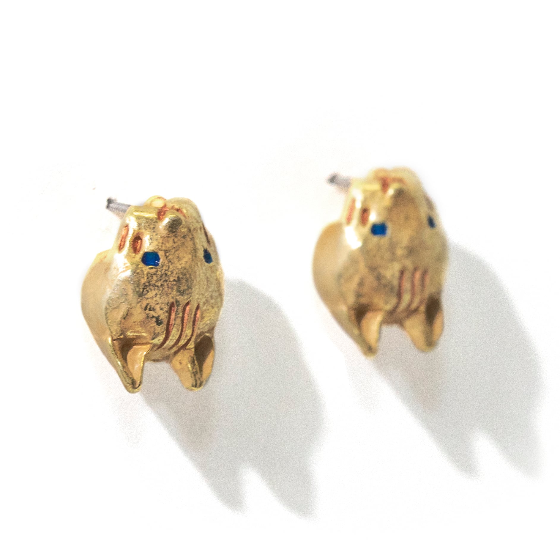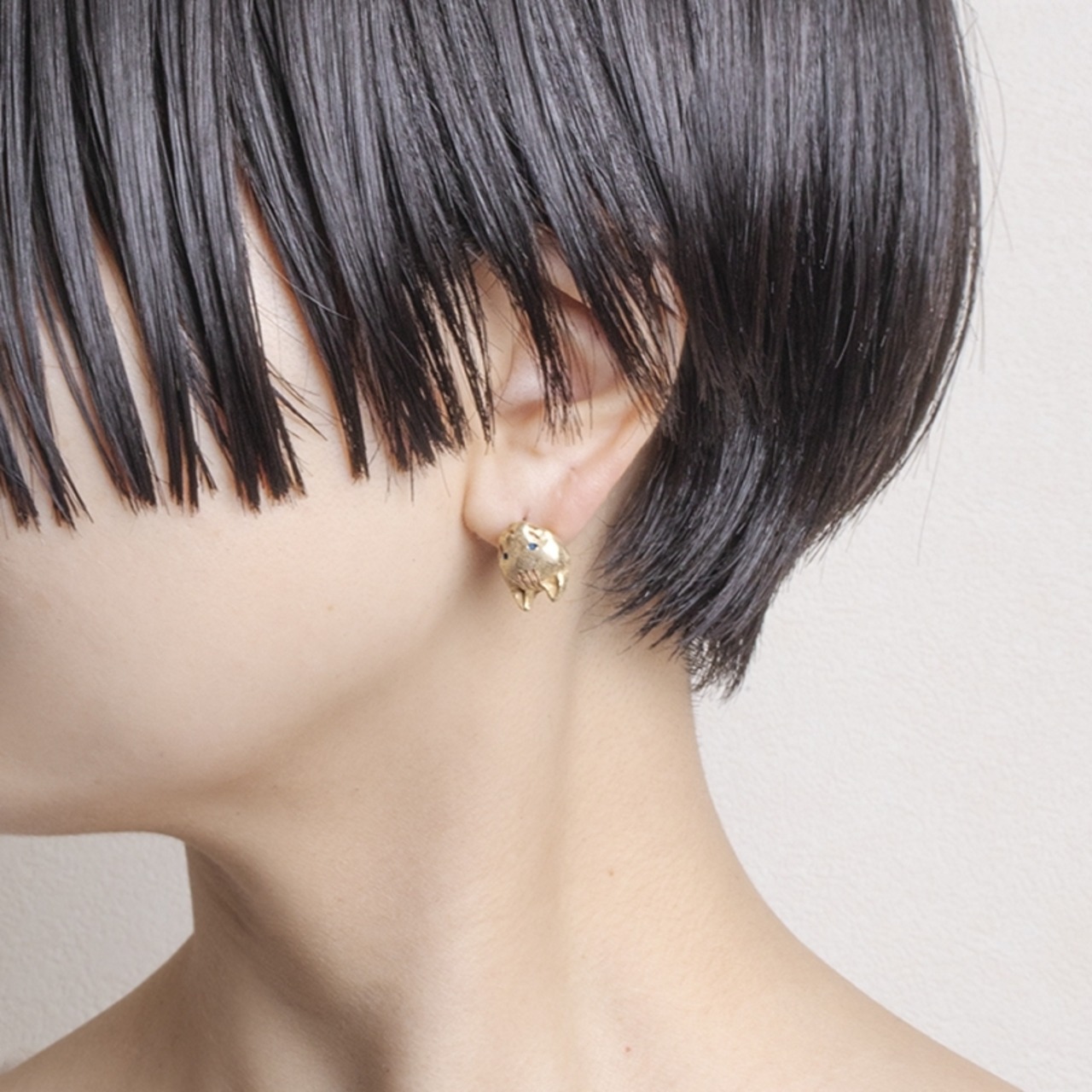 上下逆さまな向きの猫の顔のピアスは、着けてみると名前のとおり耳たぶに「ガブリ!」と噛みついているデザインです。