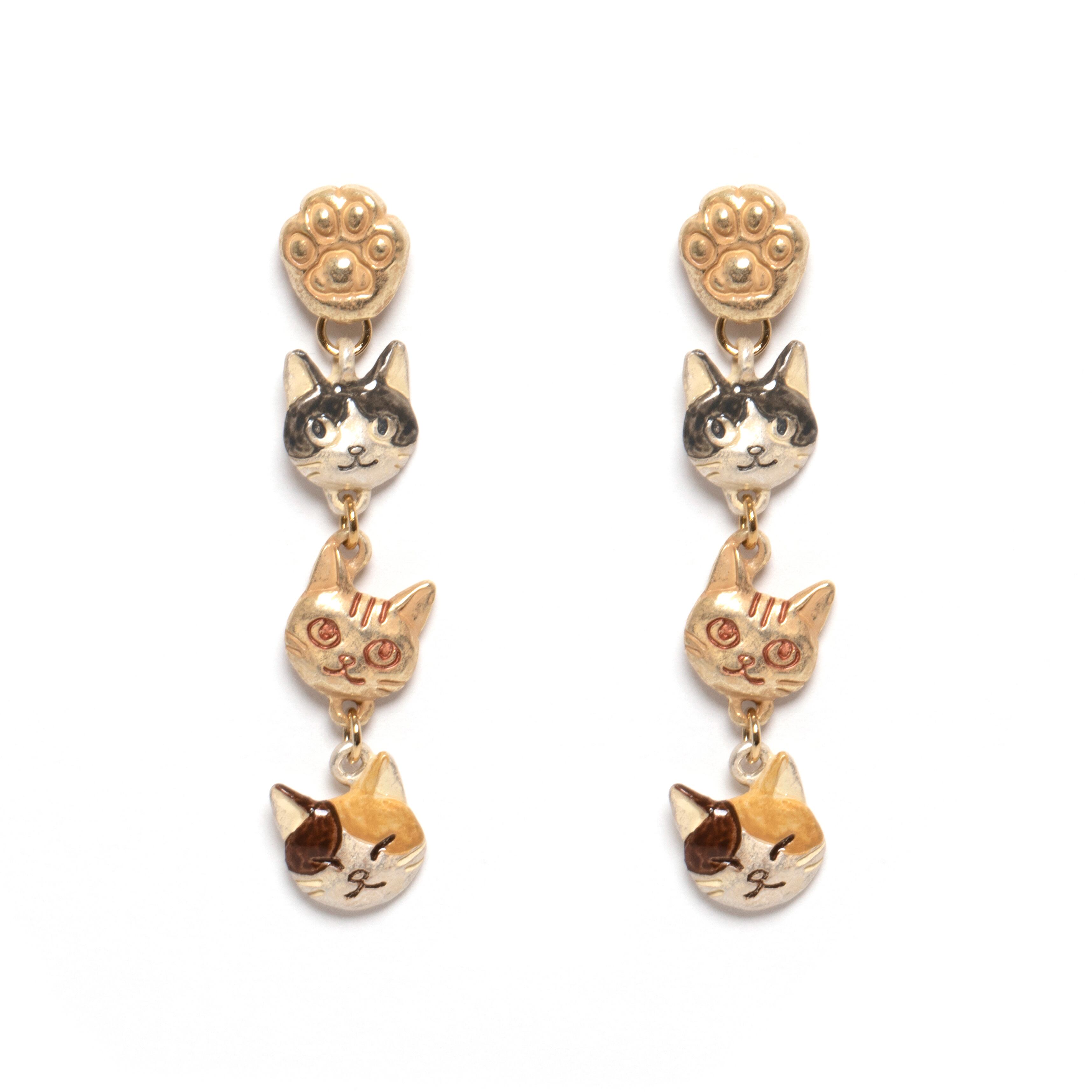おなじみの猫たちが勢ぞろいしたピアス。 ぷっくりした肉球から揺れて下がるのは、上からトム、ボス、ミケ。ご近所同士で仲良しな猫たちの、普段とは違うデフォルメされた表情がかわいらしいデザインです。