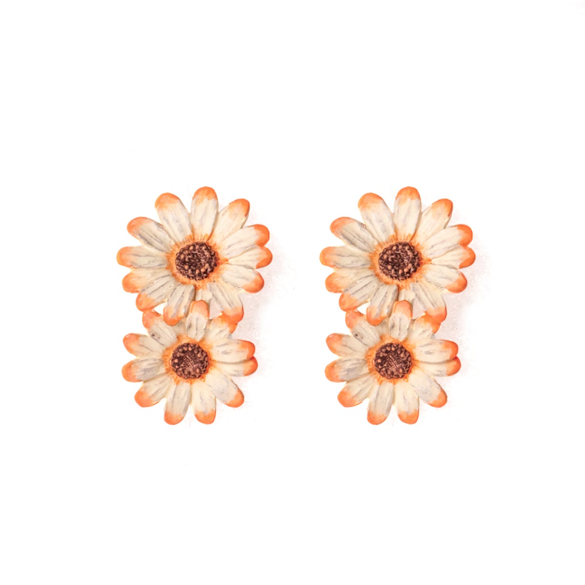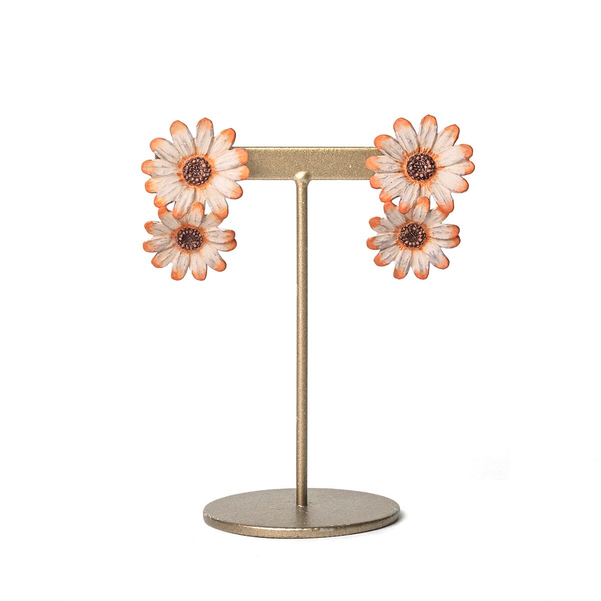 活き活きと咲きほこる二輪のディモルフォセカが並んだデザインが可愛らしいピアスは「パステリーナ」という花びらの縁にだけ色がついている品種。 動きのある重なり合ったオレンジ色の花びらの造形が美しいアクセサリーです。 ディモルフォセカの花言葉は「富」「豊富」 より本物に近付けるため、花芯部分はランダムで着色を施しております。手作業ならではの個体差としてお楽しみください。