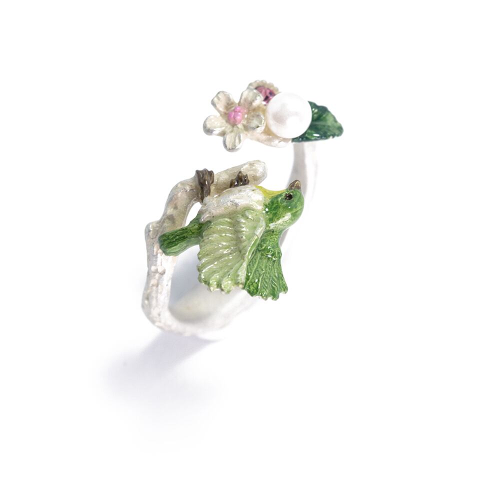 メジロがリンゴの花の蜜を吸いに飛んできた様子をイメージしたリング。キラリと光るラインストーンや花の色をイメージしたパールをあしらい品のある印象に。
