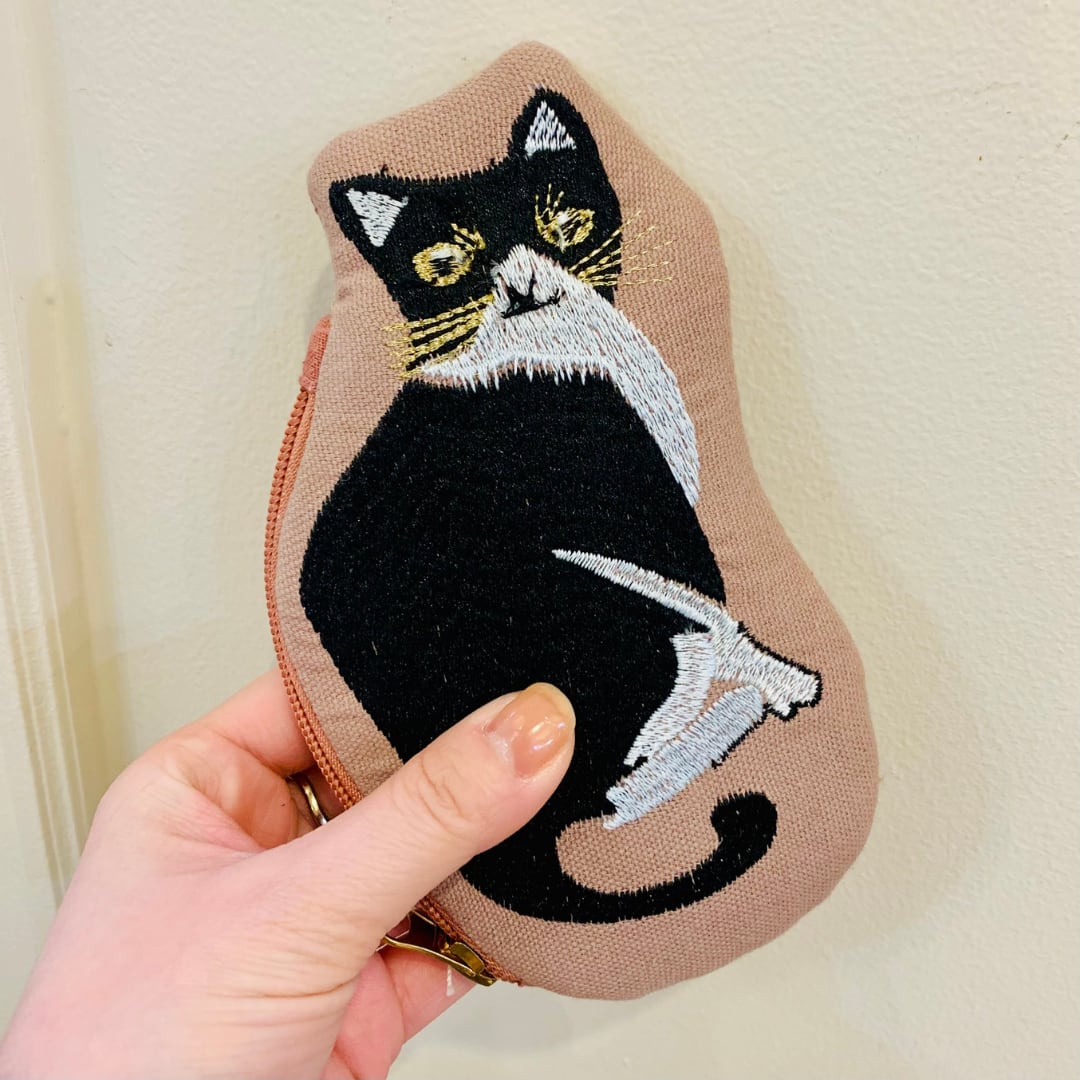 大人でも持ちやすい遊び心のあるダイカットポーチです。しっかりとしたコットン生地でお座りした猫が振り返っている刺繍が施されています。小さめなサイズ感でイヤホンやアクセサリー、無くしがちな小物を入れるのにおススメです◎