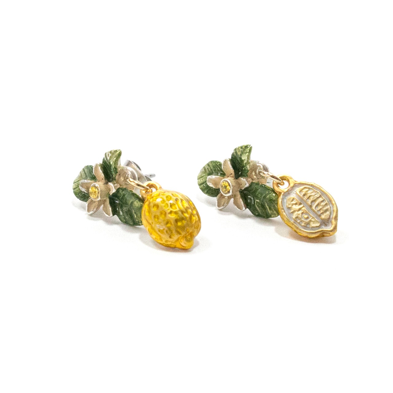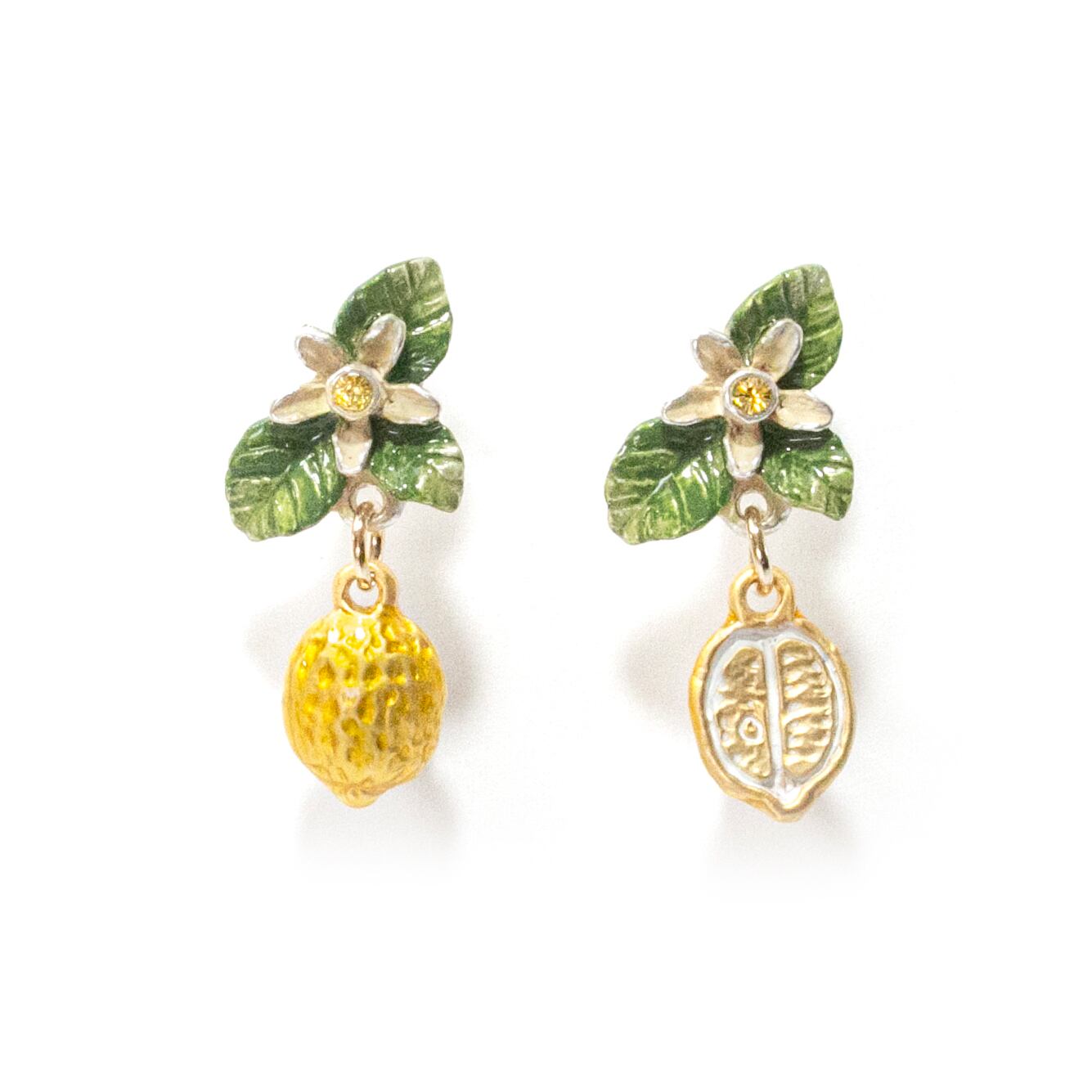 レモンの花と実をピアスにしました。果実は縦切りになっており、左右で皮面と果肉面両方楽しめます。レモンの花言葉は「誠実な愛」「思慮分別」。 レモンの実の花言葉は「熱情」