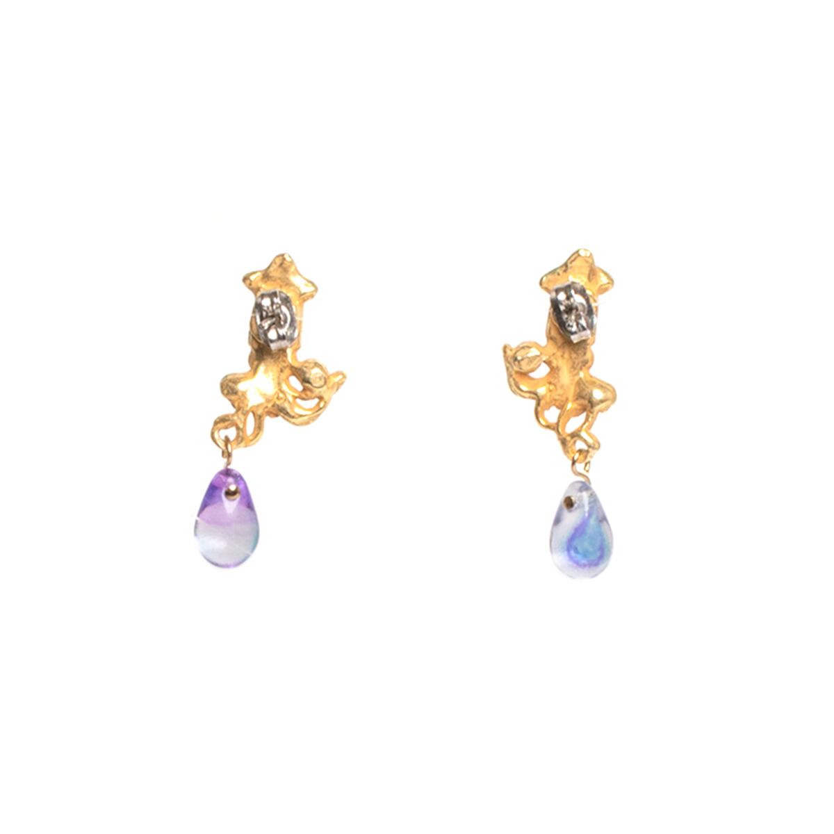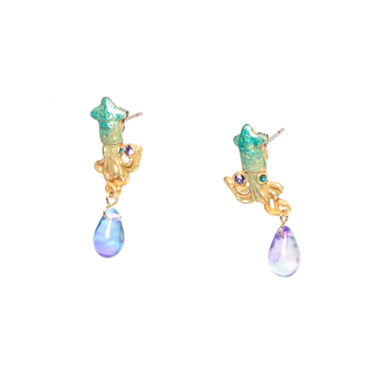暗いところでうっすらと光る塗装を施したピアスです。2匹とも何かを見つけたのか見せびらかすようにカットガラスを持っています。下のビーズは深い海の色をイメージして青・紫系のものを使用しています。
