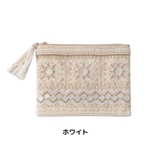 光沢のある生地に花柄や幾何学模様のモチーフをビーズ刺繍で繊細に施したポーチです。コスメポーチとして、バッテリーなどのモバイルグッズの収納にもおススメです。タッセル付きで開閉しやすいです。