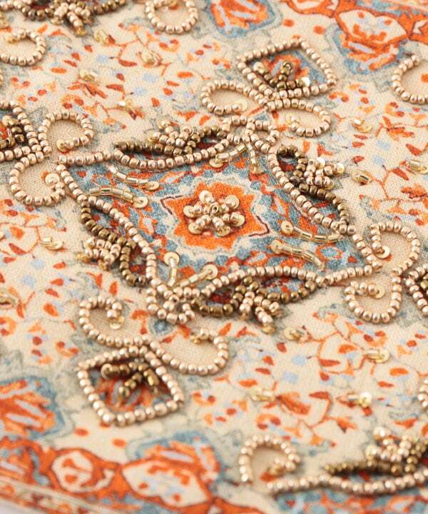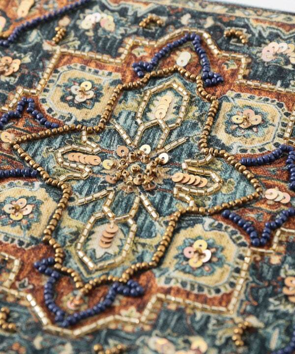 インドのヴィンテージラグをプリントした上にビーズ刺繍をあしらった華やかなポーチです。コスメやモバイルグッズの収納におススメです◎フラットなのでバッグの中でも嵩張りにくいです。タッセルが付いているので開閉しやすいです。