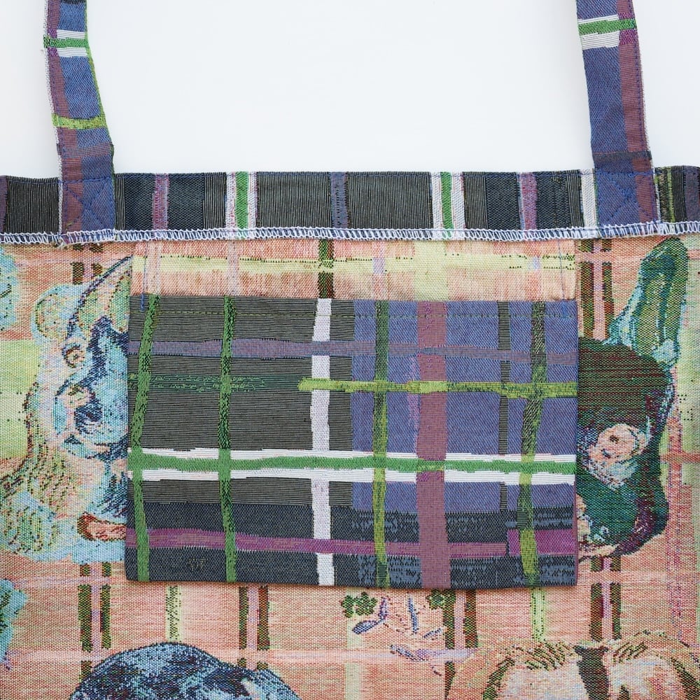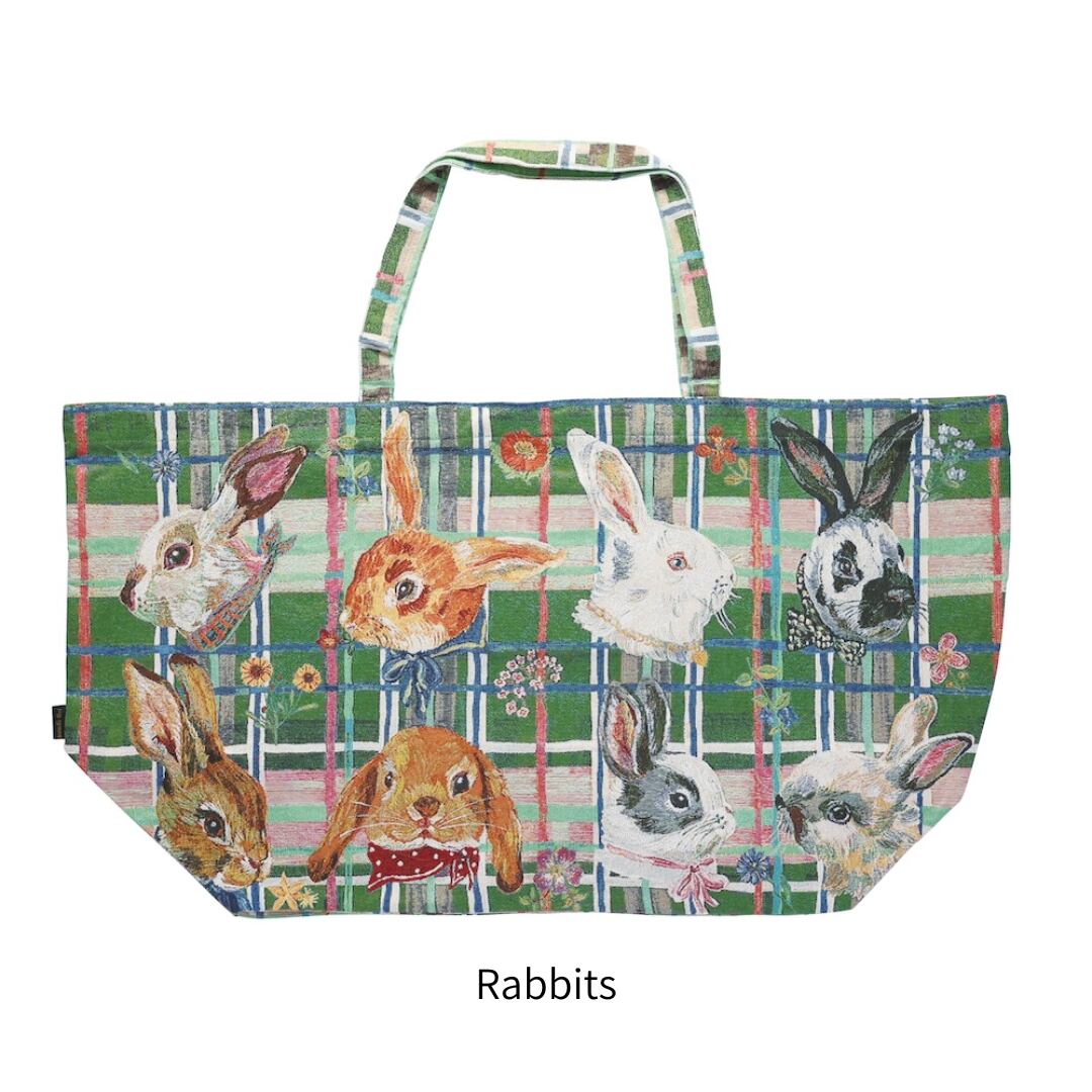 ユーモラスな表情の動物たちと懐かしさ漂うチェック柄のマーケットバッグです。重厚感あるゴブラン織りで、織り込まれたモチーフは小さな絵画の様です。しっかりとした生地感で日々の買い物やお出掛けにぴったりです。