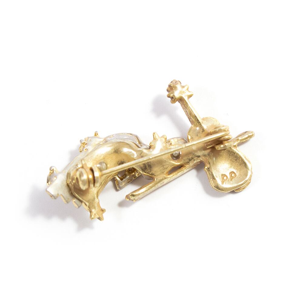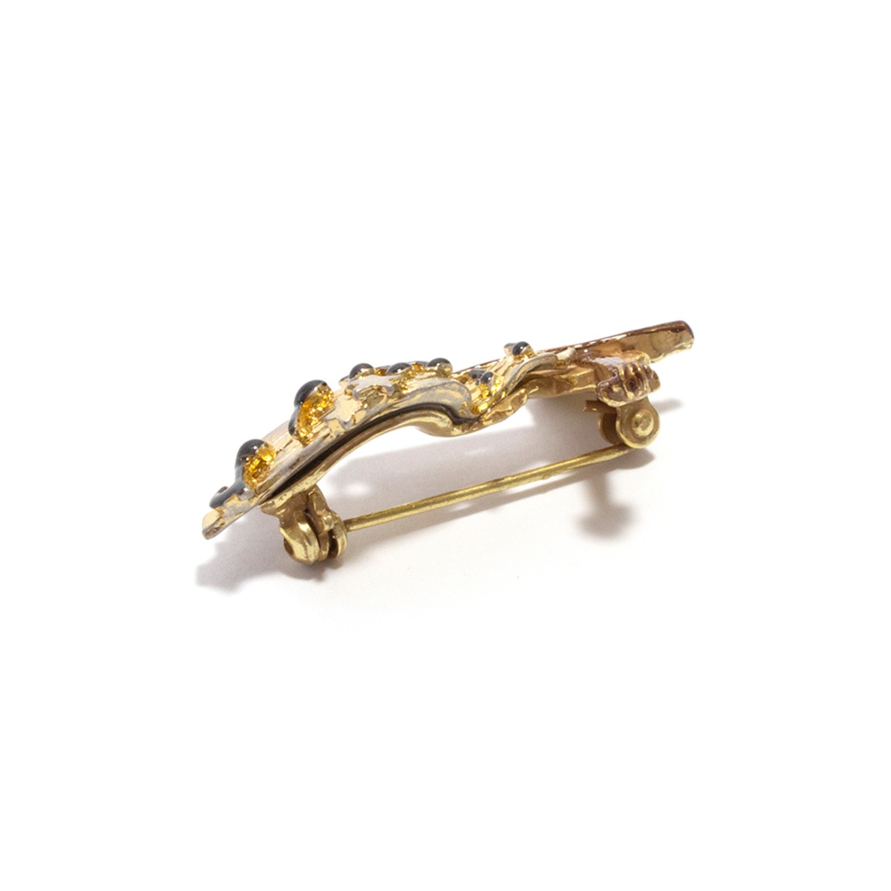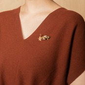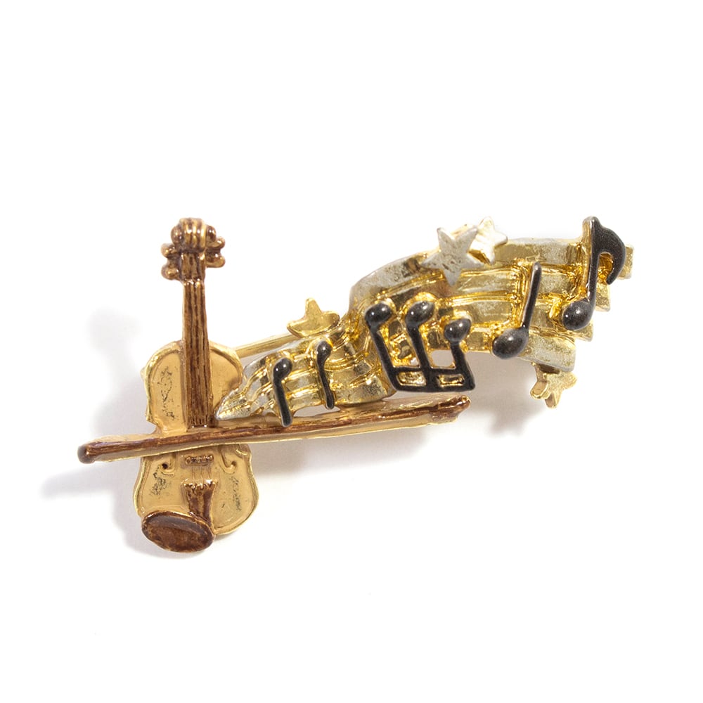 ブラームスの『雨の歌』を奏でるバイオリンをイメージしたブローチです。正確ではありませんが楽譜も第一楽章の冒頭を参考に作られています。ブラームスの出身地ドイツでは雨の間に太陽が見えることが多いそうです。雨粒に太陽の光が当たりキラキラと輝く様子をゴールドの色合いを生かして表現しました。ベレー帽やジャケットの襟に付けるのがおススメです。