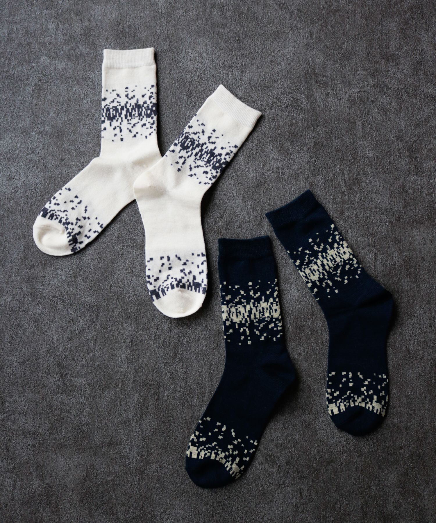 シンプルなデザインのクルーソックス、控えめなので無地感覚で使えます。メリノウールを60%使用し薄手で暖かい◎