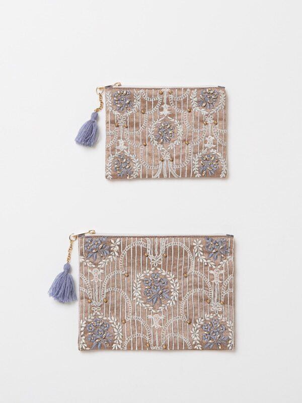 光沢のある記事にビーズ刺繍をあしらった華やかなポーチです。コスメやモバイルグッズの収納におススメです◎フラットなのでバッグの中でも嵩張りにくいです。タッセルが付いているので開閉しやすいです。