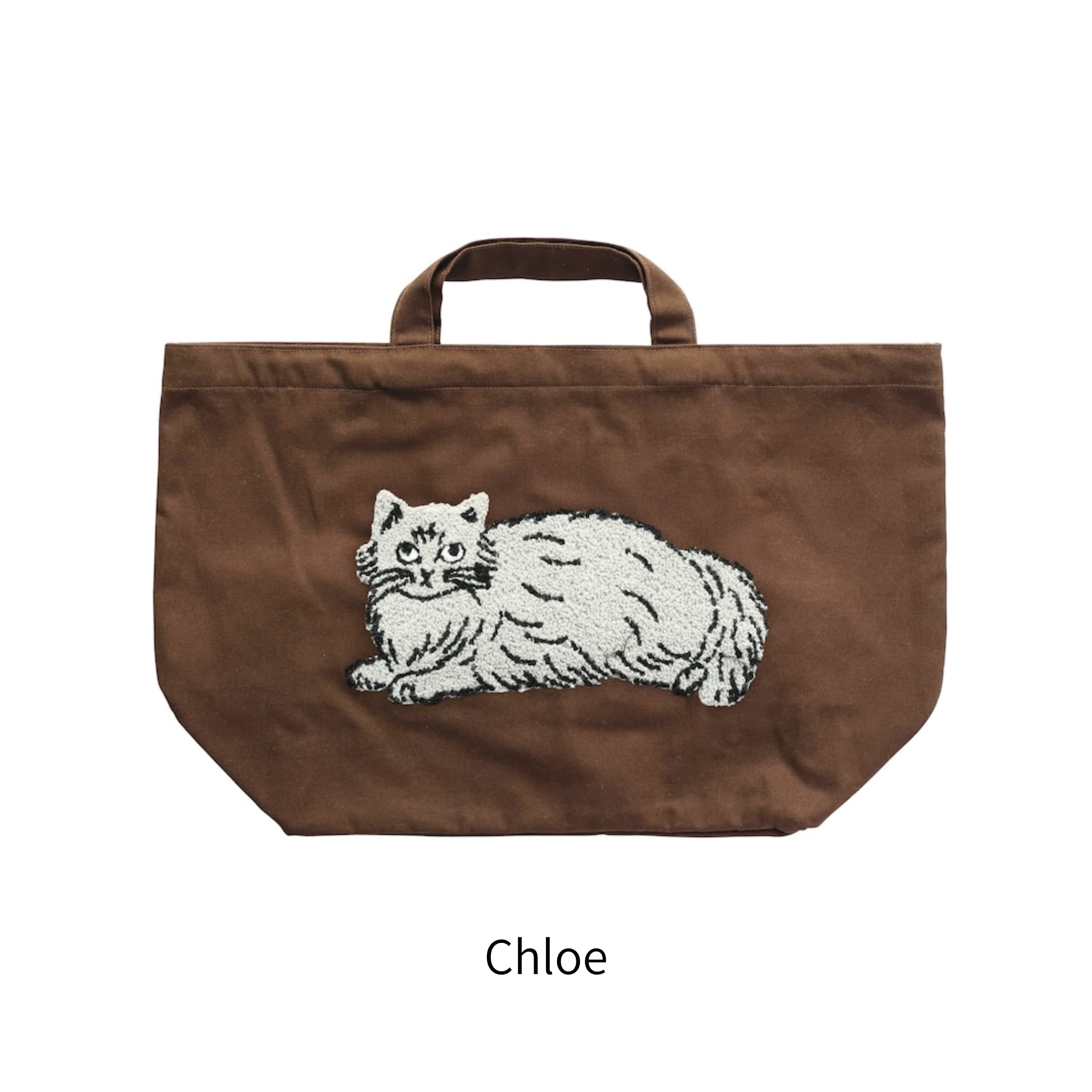ボート型のトートバッグに、ふわふわのモコモコ刺繍でネコの顔をあしらっています。