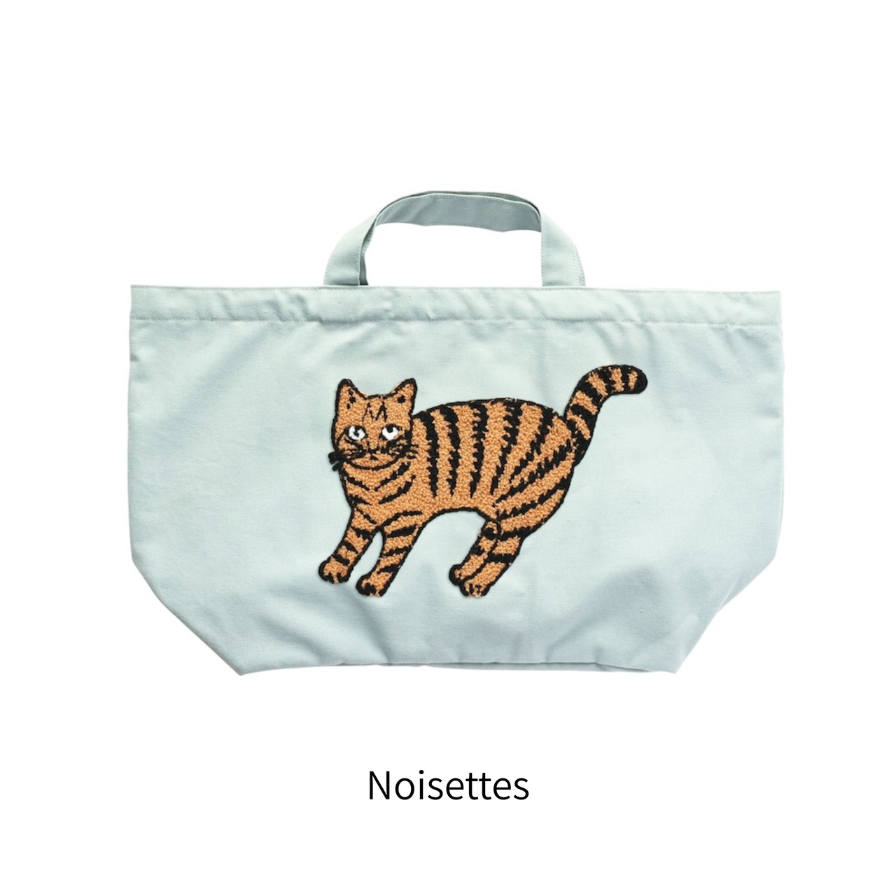 どこかとぼけた表情が愛らしい、松尾ミユキさんデザインのネコ刺繍トートができあがりました。