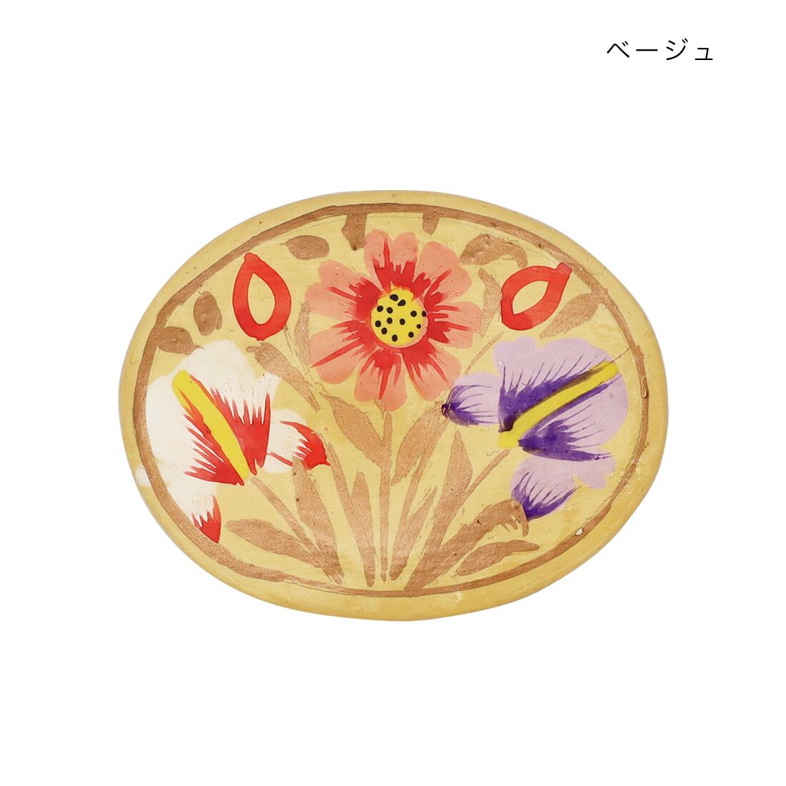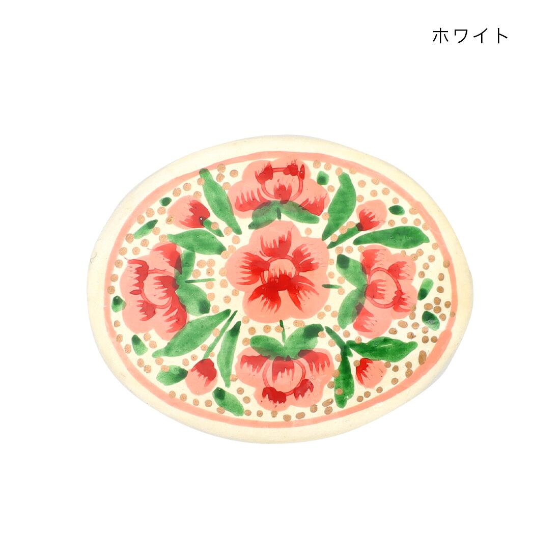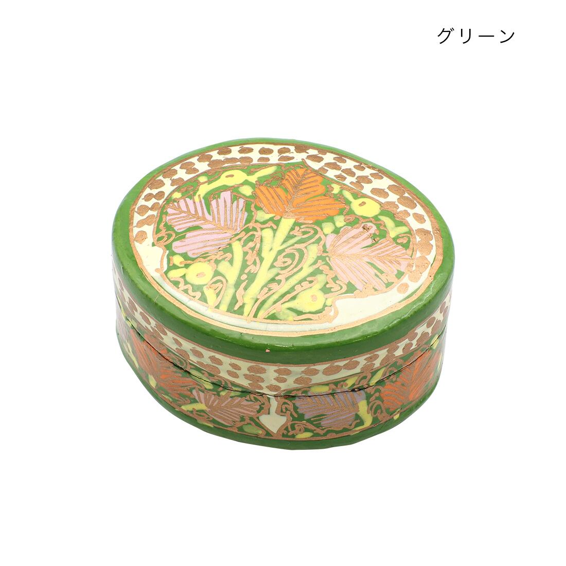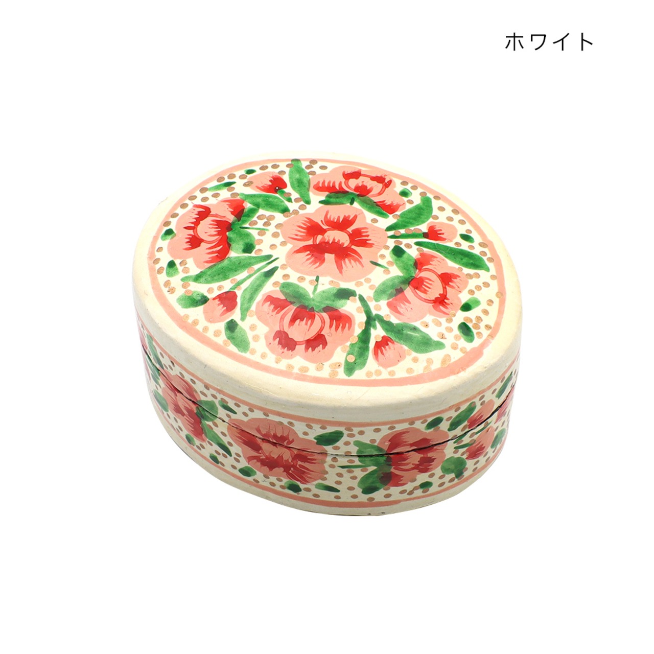 インド、カシミール地方の伝統的な紙細工「ペーパーマッシュ」アイテム。紙と紙粘土で形を作り、手描きで花柄や猫などの柄を描いています。ピアスやリングなどアクセサリーの収納や小物入れにおススメです◎