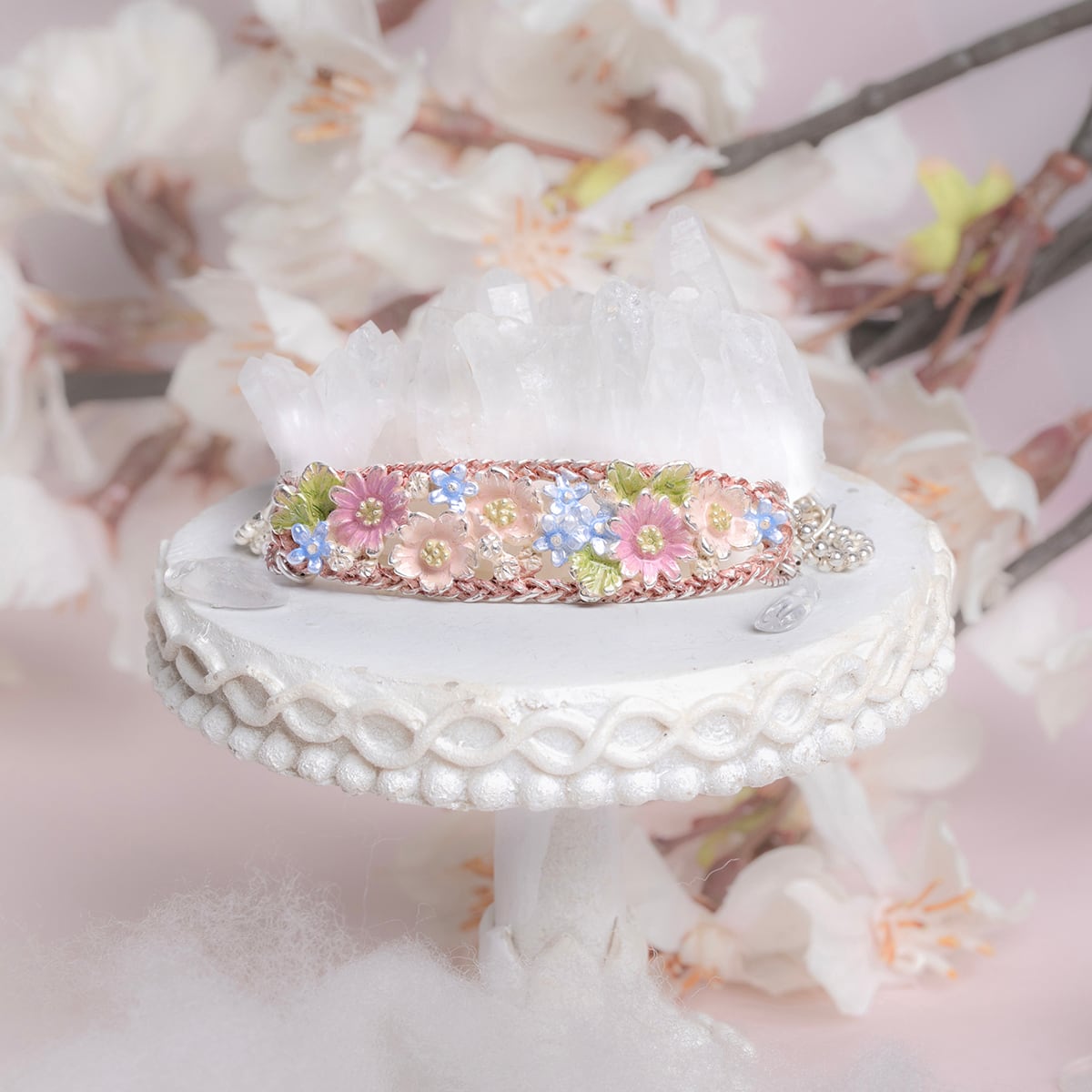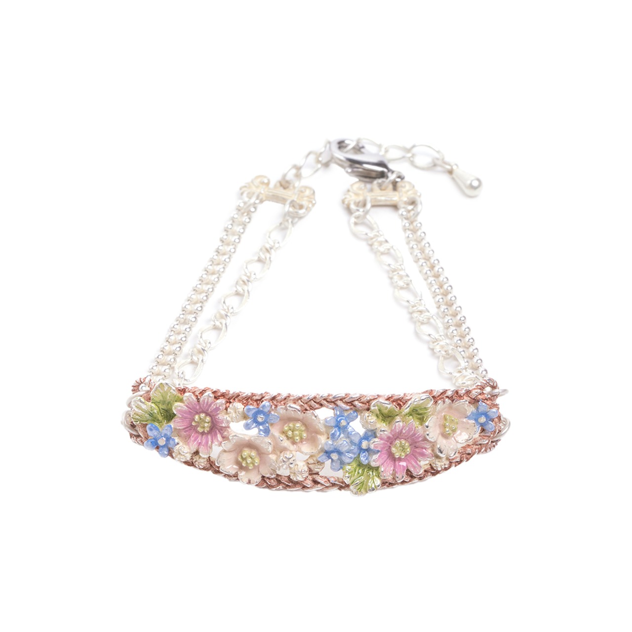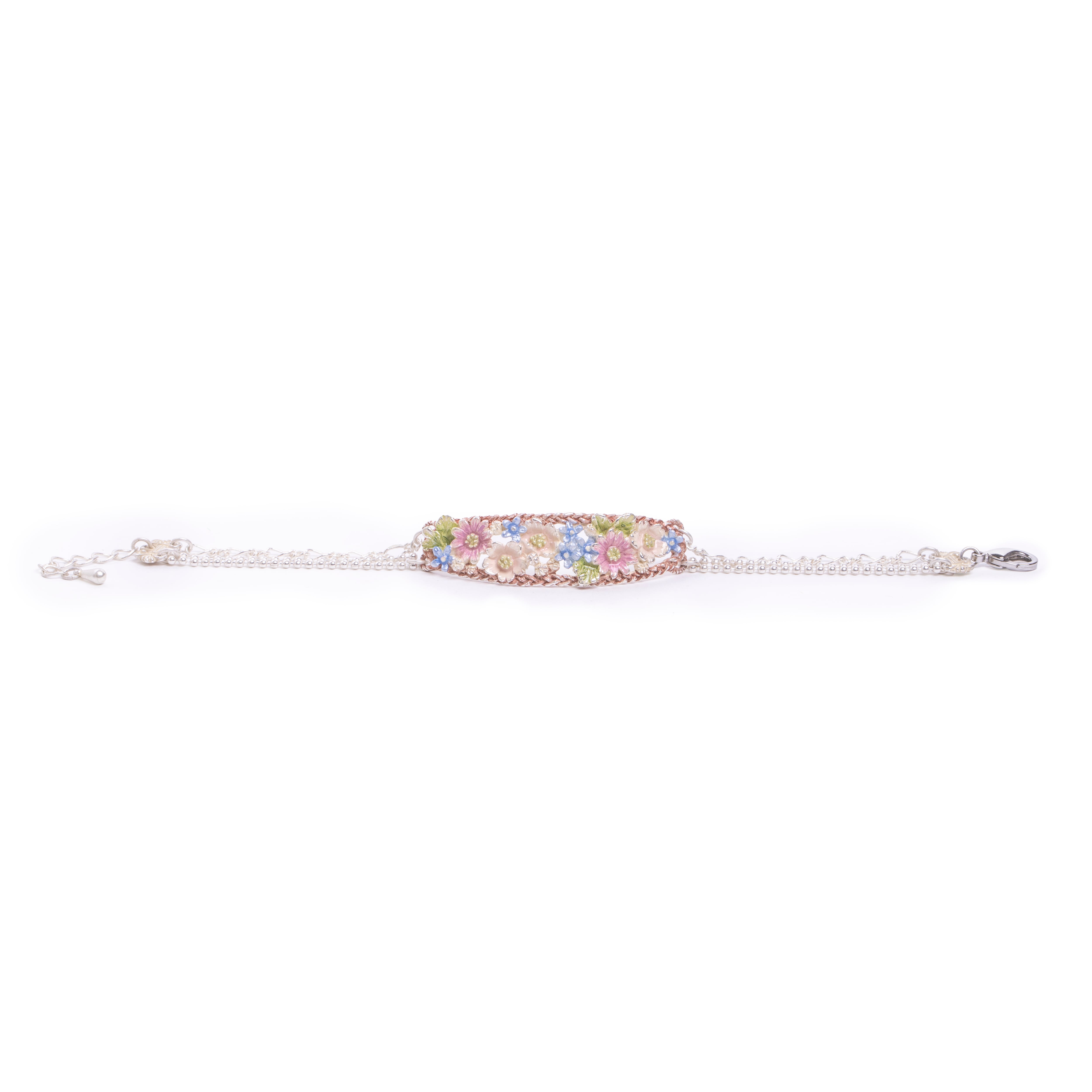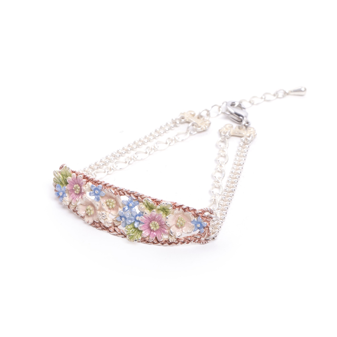 ギュッと花々を詰め込んだバスケットがモチーフのブレスレット。花々の間には透かしを取り入れ、軽い印象になっています。全体的に優しい色合いで上品な印象を与えてくれます。